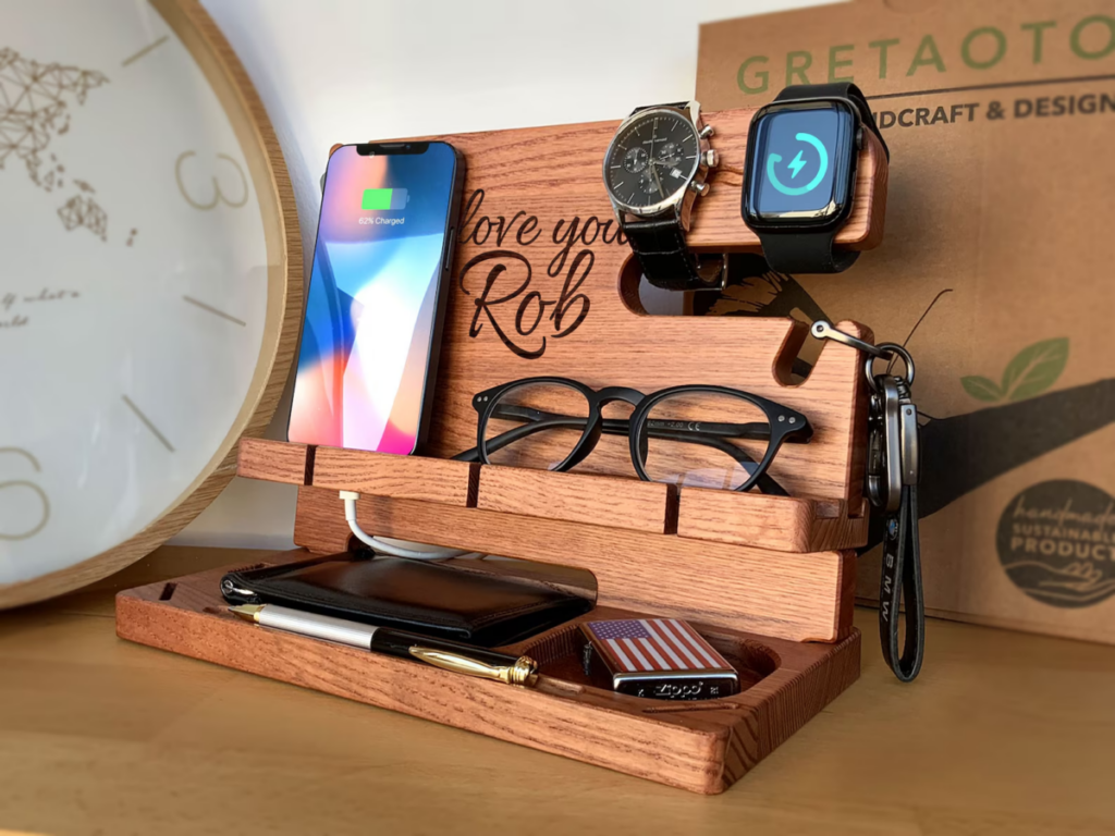 A custom docking station is a perfect gift for keeping his tech gadgets organized. These wooden stands typically hold his phone, watch, keys, and even glasses, making it easier for him to keep everything in one spot. Personalize it with his name or a meaningful message for an extra special touch.