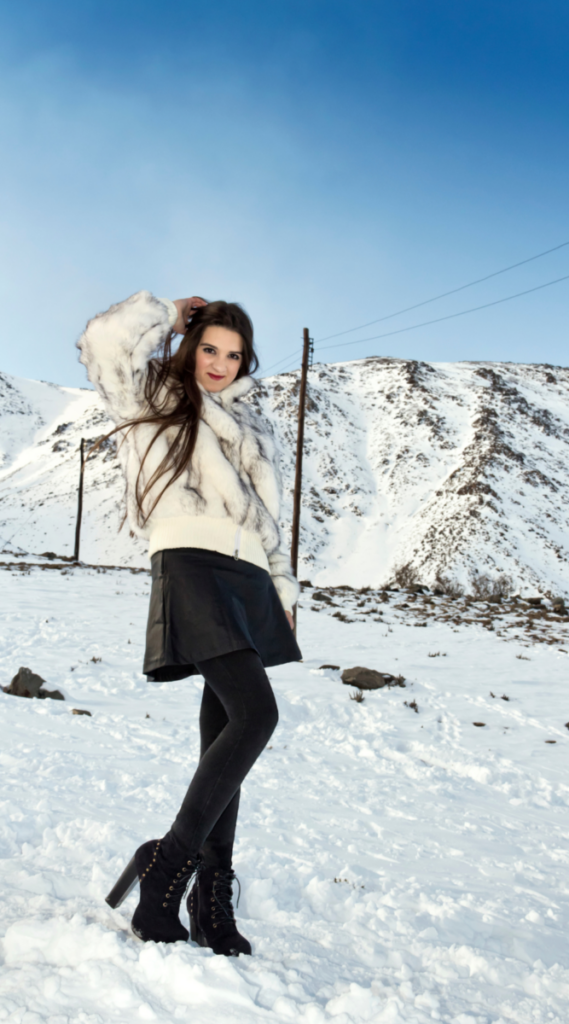 This outfit is the perfect combination of luxury and edge, featuring a chic faux fur jacket paired with a leather skirt. The white and grey tones of the fur jacket provide a striking contrast to the black skirt and tights, creating a balanced look that stands out against the winter landscape. The heeled lace-up boots add height and give the outfit a sophisticated, yet bold finish.