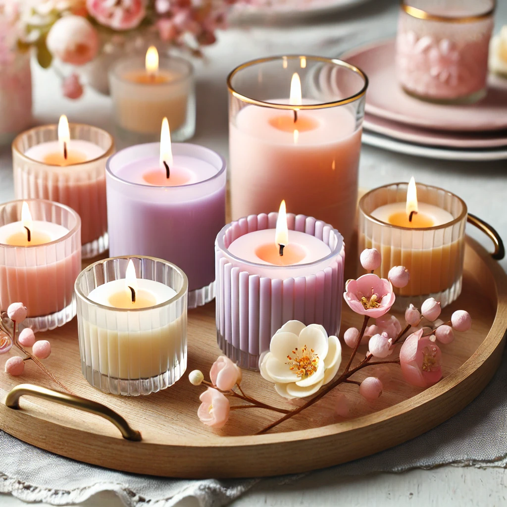 This arrangement of pastel-colored candles in shades of lavender, blush pink, and pale yellow creates a serene and inviting vibe. Placed on a wooden tray, the soft glow from the candles enhances the cozy ambiance of spring evenings.