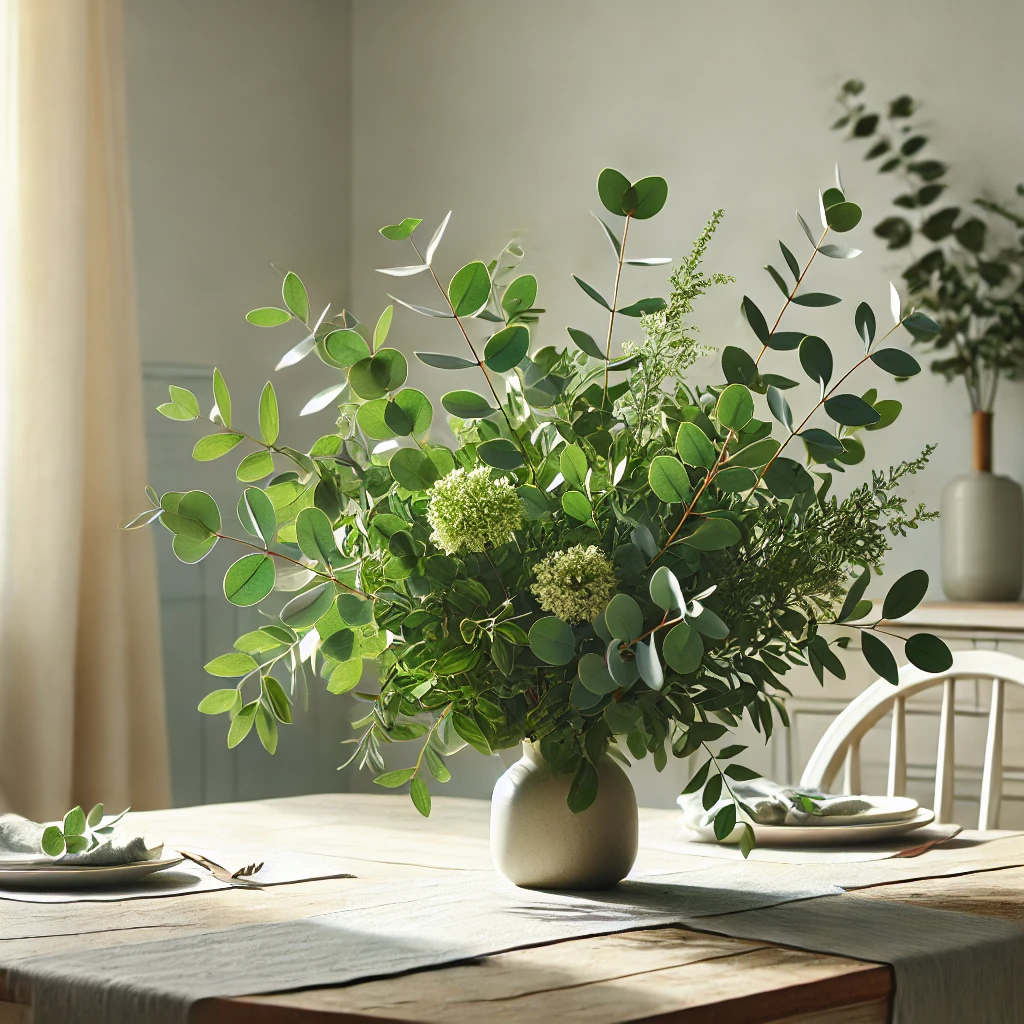 This elegant greenery centerpiece features eucalyptus leaves paired with small white blossoms, creating a fresh and natural look. The lush foliage brings the outdoors in, perfectly capturing the vibrancy of spring.