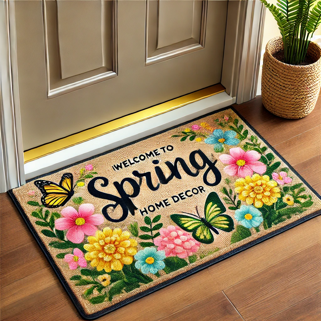 This cheerful spring-themed door mat features bright floral and butterfly designs in pink, yellow, and green. It adds a welcoming pop of color to your entryway, setting a happy and inviting tone for the season.