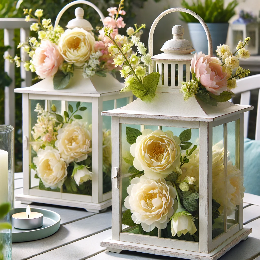 These charming garden-inspired lanterns are filled with faux flowers and lush greenery, adding a vibrant touch to your patio or indoor space. Their soft pastel hues of white and cream create a serene and elegant vibe, perfect for spring.