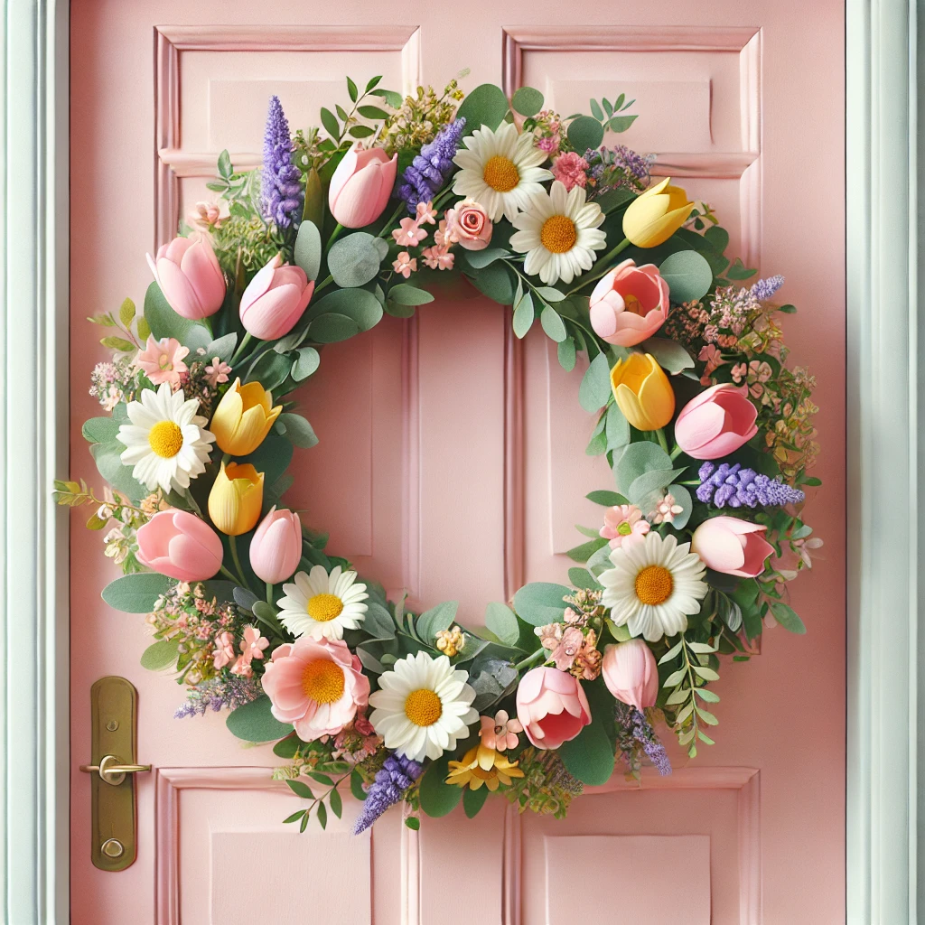 This vibrant artificial floral wreath is crafted with tulips, daisies, and soft greenery in pastel shades of pink, yellow, and lavender. Hung on a pastel-colored door, it becomes the ultimate spring statement piece for your home.