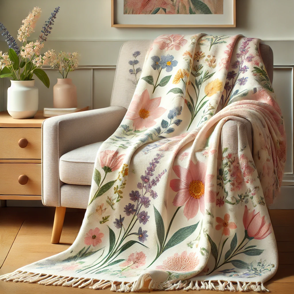 This floral-printed throw blanket draped over a cozy armchair showcases delicate spring flower patterns in pastel shades of pink, lavender, and yellow. Lightweight and soft, it adds warmth and charm to your living space while celebrating the season’s beauty.