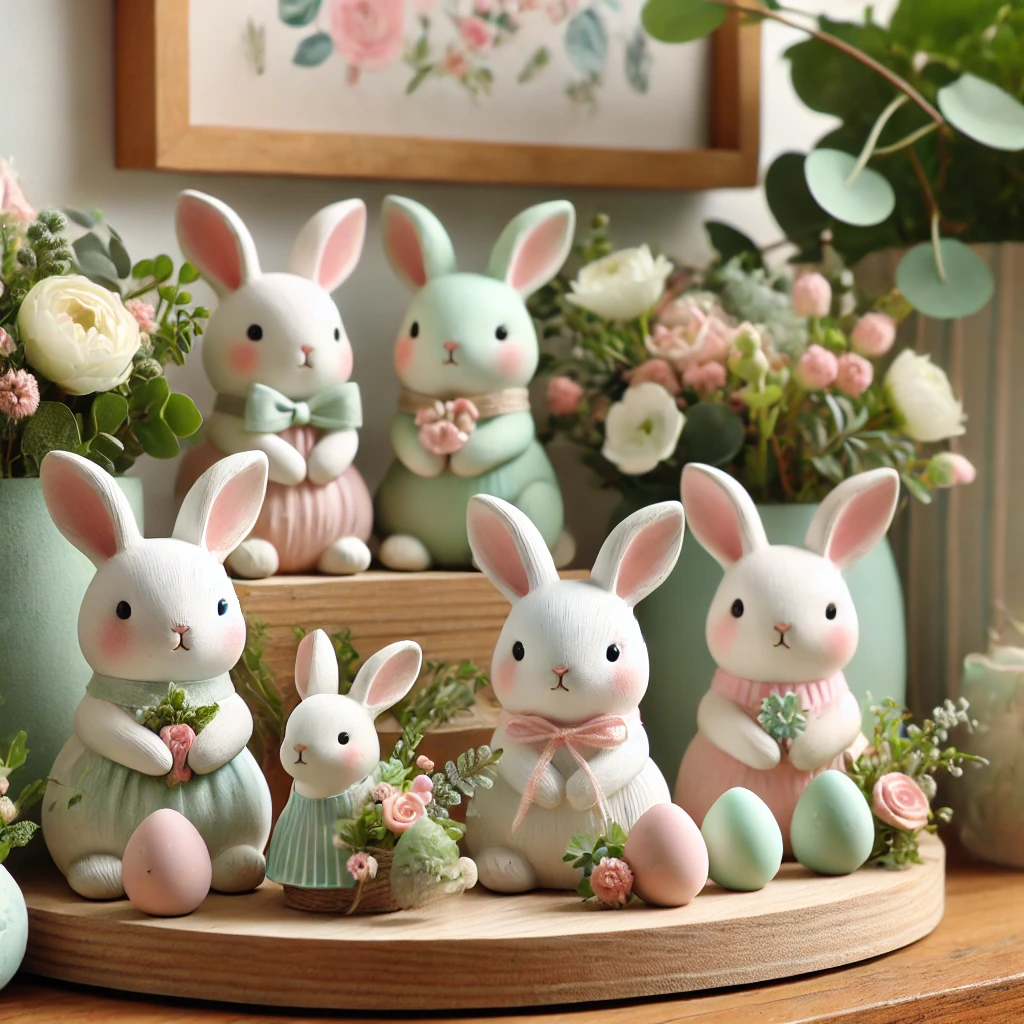 These adorable bunny figurines, crafted in pastel shades of light pink, mint green, and white, bring a whimsical touch to a wooden shelf. Surrounded by small flowers and greenery, they create a festive and playful spring display.