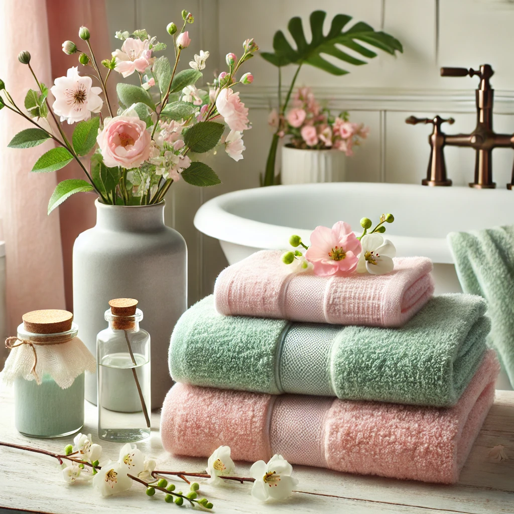 This bathroom decor features pastel-colored towels in soft blush pink and mint green, complemented by a small vase of fresh flowers on the countertop. The gentle hues and natural elements create a refreshing and serene atmosphere, transforming the space into a spring retreat.