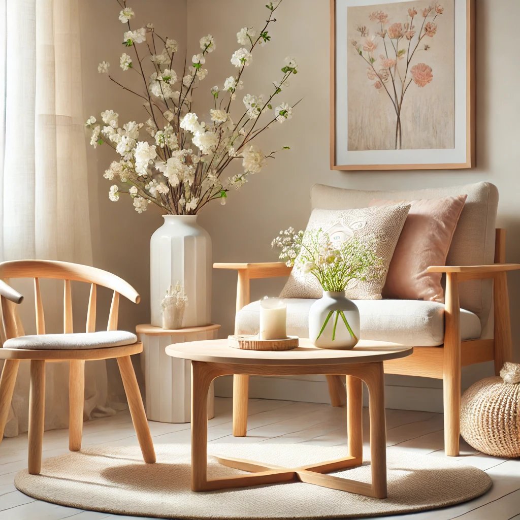 This cozy living room setup features light wooden furniture, including a whitewashed coffee table and a pale oak accent chair. Accented with pastel-colored throw pillows and a vase of fresh flowers, the space exudes natural springtime charm.