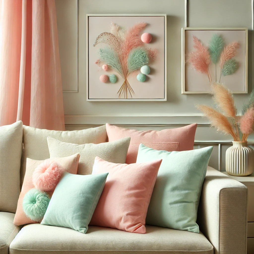 These pastel throw pillows in soft shades of pink, mint green, and baby blue bring a touch of spring to a light beige couch. The gentle colors add a pop of seasonal charm, creating a bright and inviting living space.