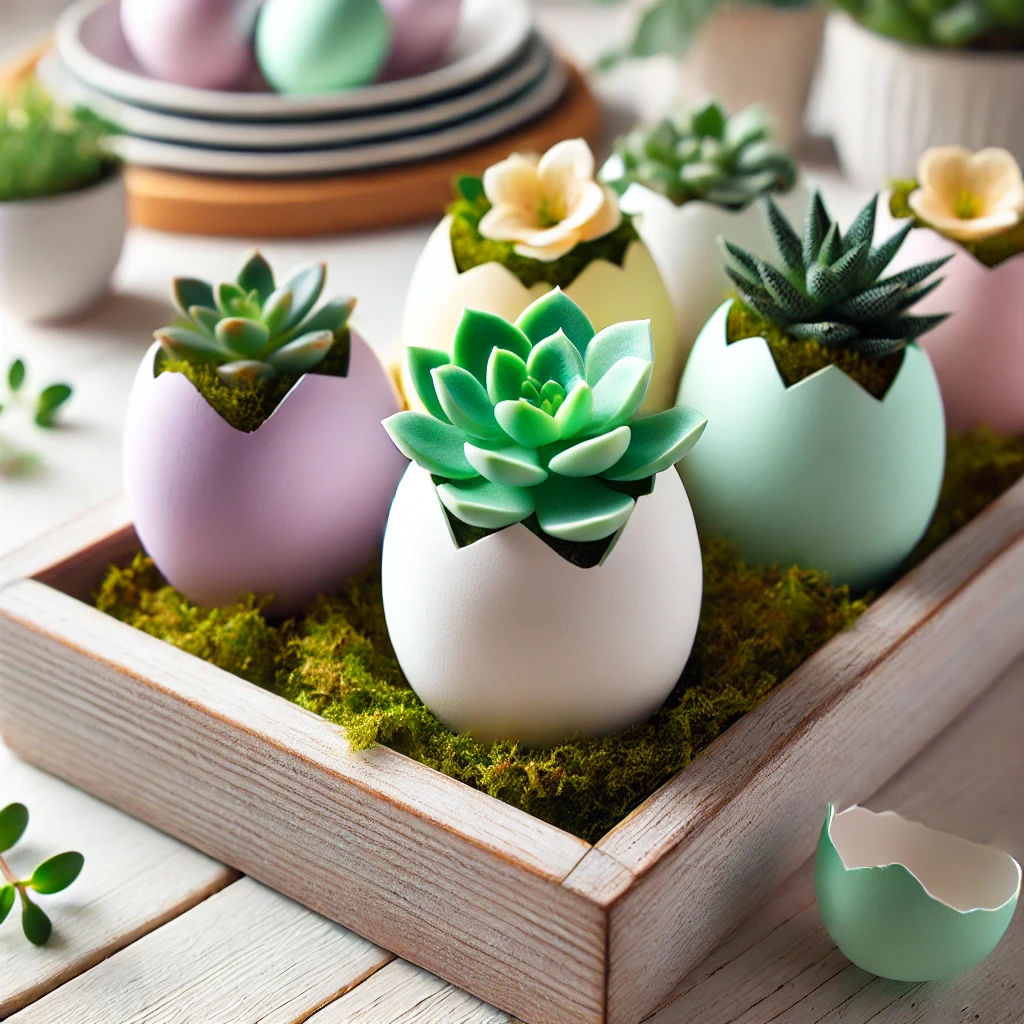 These whimsical eggshell planters, painted in pastel shades of lavender, mint green, and soft yellow, hold tiny succulents and moss. Arranged on a wooden tray, they add a playful and eco-friendly touch to your spring decor.