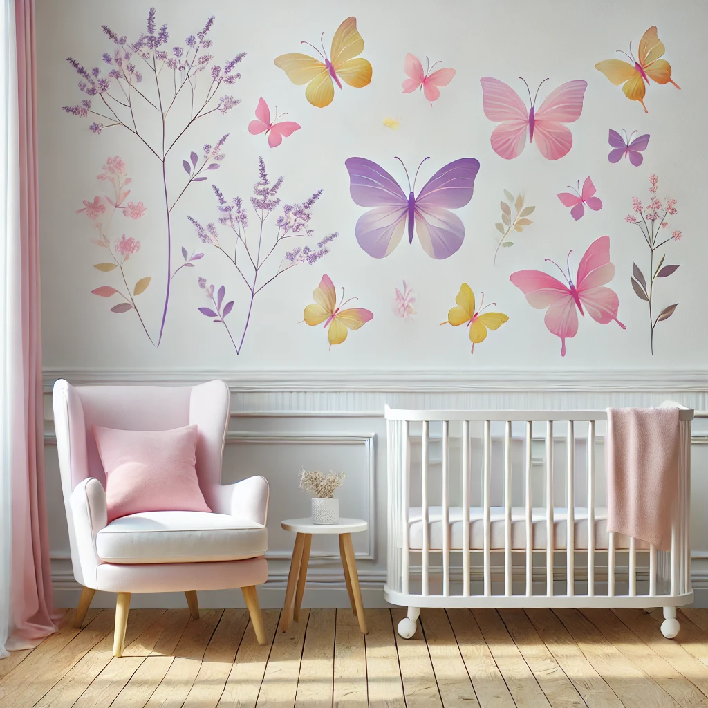 These enchanting butterfly wall decals, in shades of lavender, pink, and yellow, bring a whimsical touch to a pastel-themed room. Arranged to look as if they’re fluttering across a white wall, the decals add movement and charm to the space.