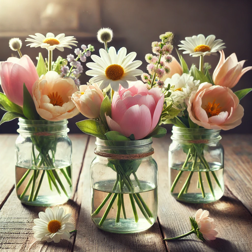 These mason jars, filled with pastel flowers like tulips, daisies, and peonies, make the perfect spring centerpiece. Arranged on a rustic wooden table, they exude simplicity and charm, capturing the natural beauty of the season.
