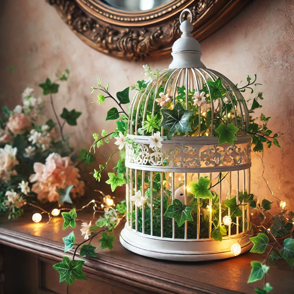 This elegant white birdcage is adorned with faux ivy, pastel flowers, and glowing fairy lights, creating a magical spring centerpiece. Placed on a wooden mantel, it brings a fresh garden vibe indoors.