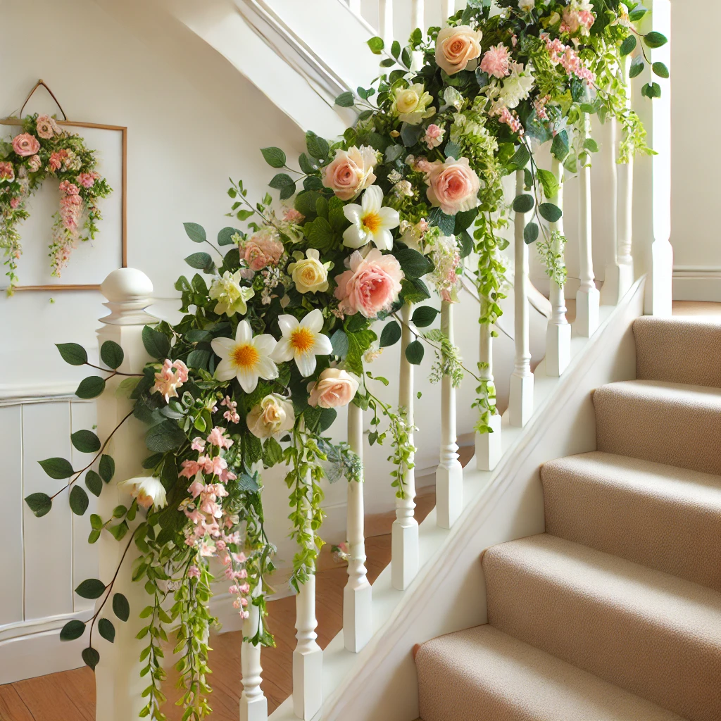 This stunning garland, draped along a staircase railing, features artificial pastel-colored flowers like roses and daisies intertwined with lush greenery.