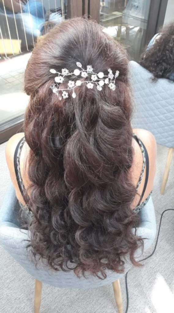 This voluminous half up style is full of bounce and texture, giving a glamorous feel that’s perfect for such a proud moment. The curls cascade beautifully down the back, creating an effortlessly graceful look that works well with or without a cap. The delicate floral clip adds a touch of elegance and helps secure the top section for a neat finish. This hairstyle is ideal if you want a feminine, camera-ready look that stays in place all day.